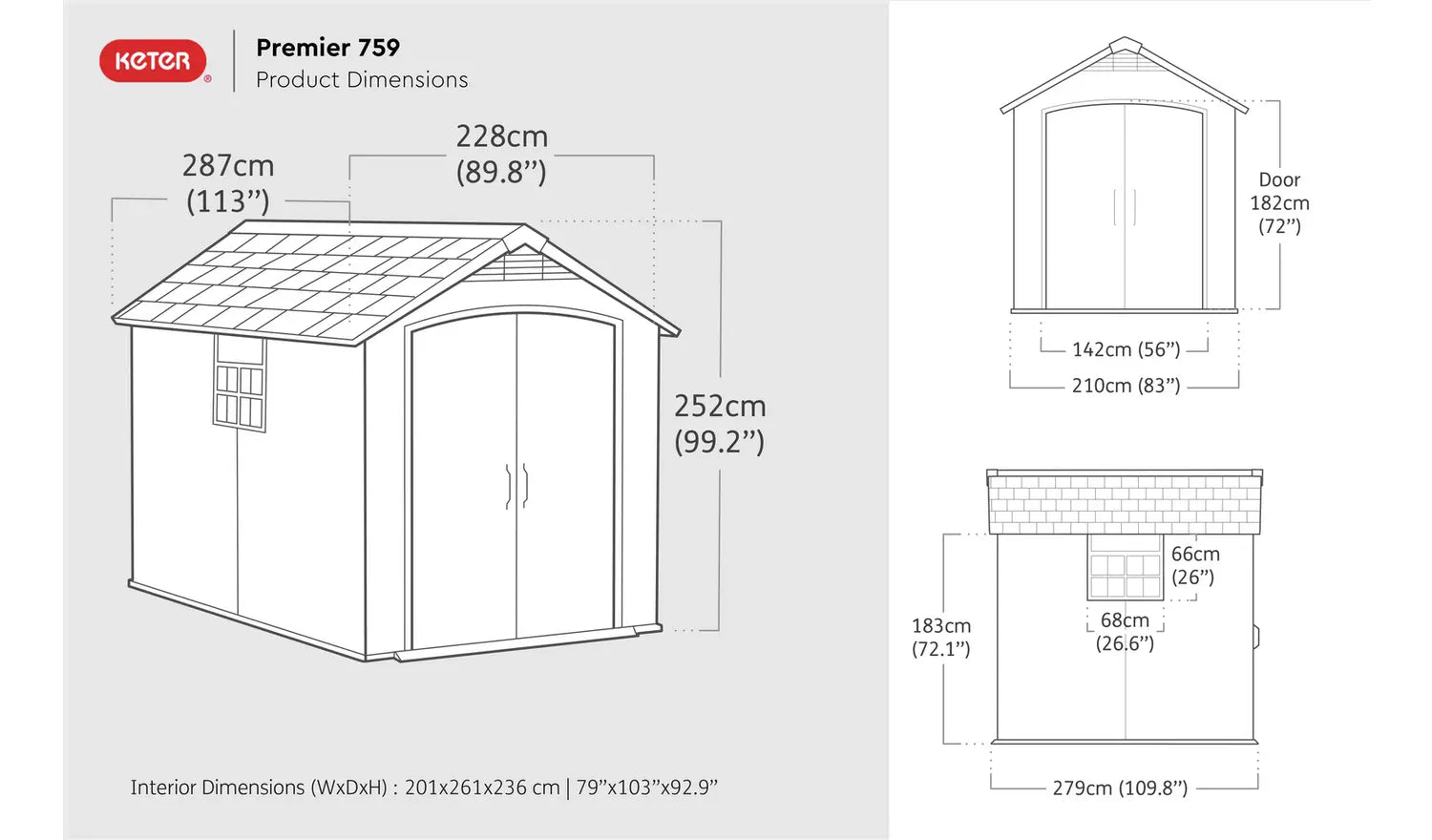 - Assembled external dimensions: 228 x 287 x 252 cm (W x D x H); internal dimensions: 201 x 261 x 236cm (W x D x H)